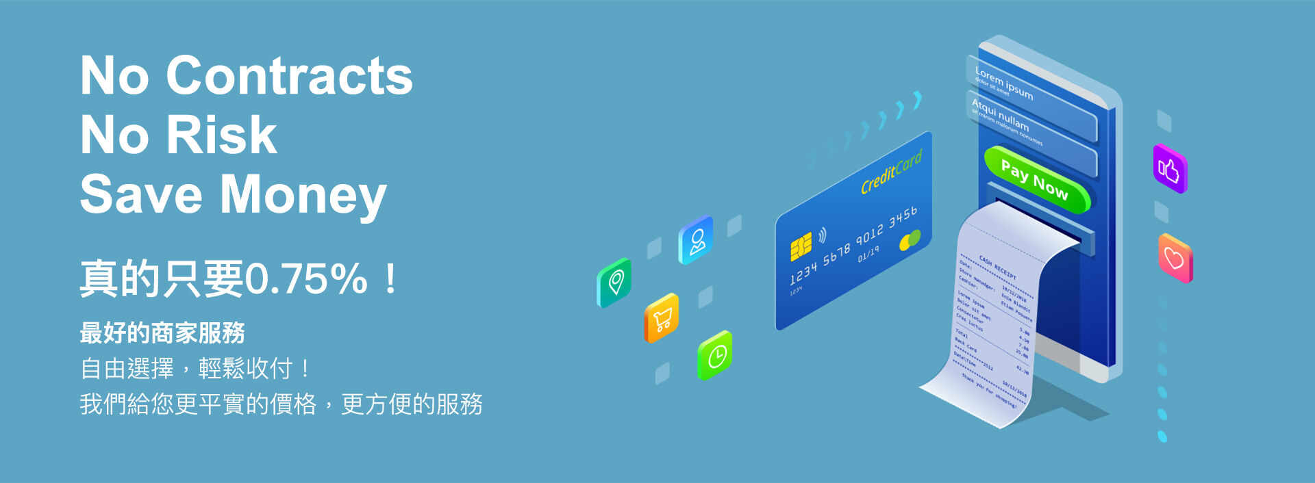 自由選擇,輕鬆收付! 我們給您更平實的價格,更方便的服務。 真的只要0.75%手續費!
